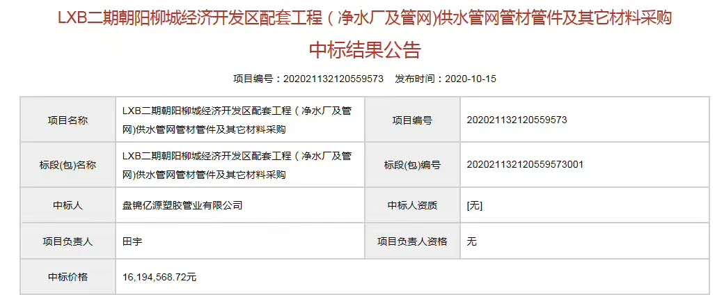 【慶祝盤錦億源塑膠管業(yè)有限公司喜中LXB朝陽柳城經濟開發(fā)區(qū)凈水廠供水管網項目】