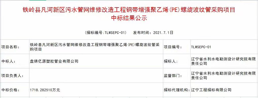 一份耕耘一份收獲,億源管業(yè)[爆竹][爆竹][爆竹]成功中標(biāo)國(guó)家環(huán)保督察項(xiàng)目鐵嶺凡河污水管網(wǎng)改造,鋼帶增強(qiáng)聚乙烯螺旋波紋1718.282510萬(wàn)元。億源管業(yè),追求卓越品質(zhì),致力于打造市政管道優(yōu)質(zhì)品牌。