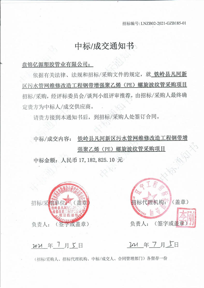 2021年6月份我公司積極參與該項目投標,并在眾多參與投標企業中脫穎而出,成功中標該項目管材獨家供應商;中標通知書: