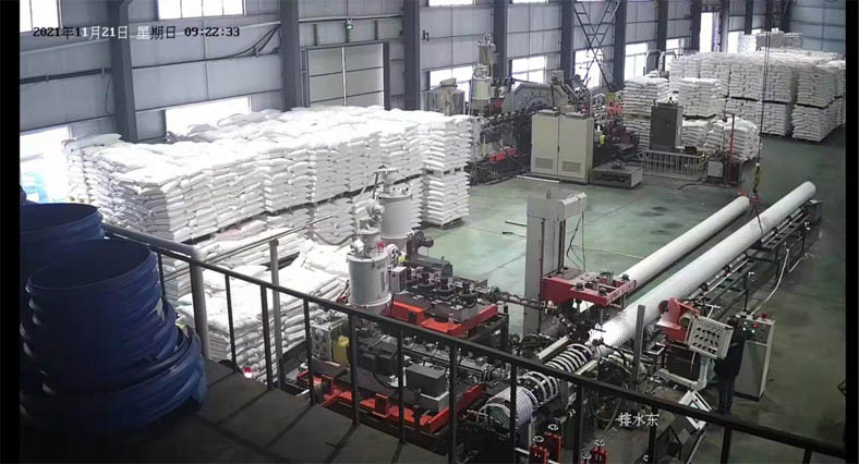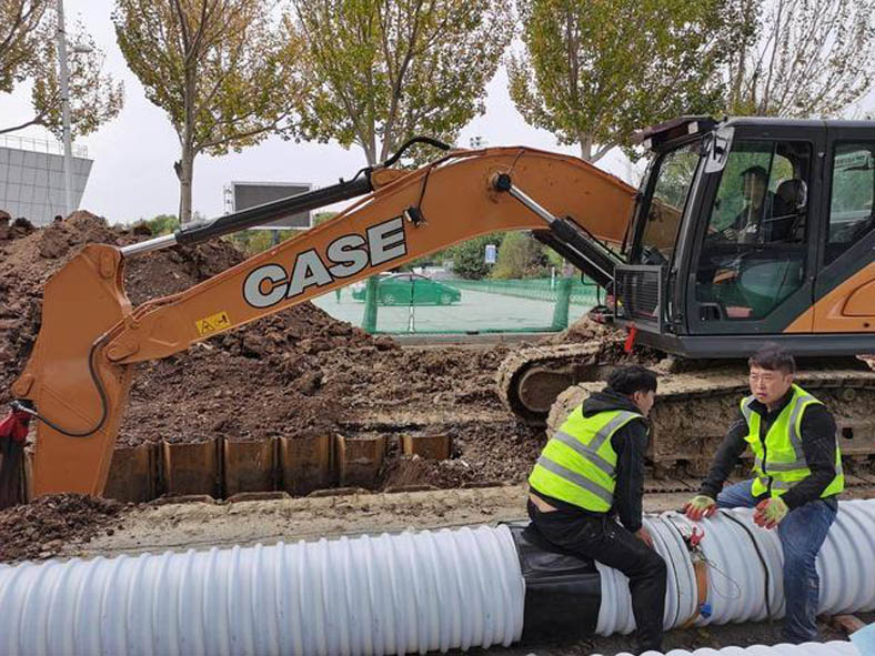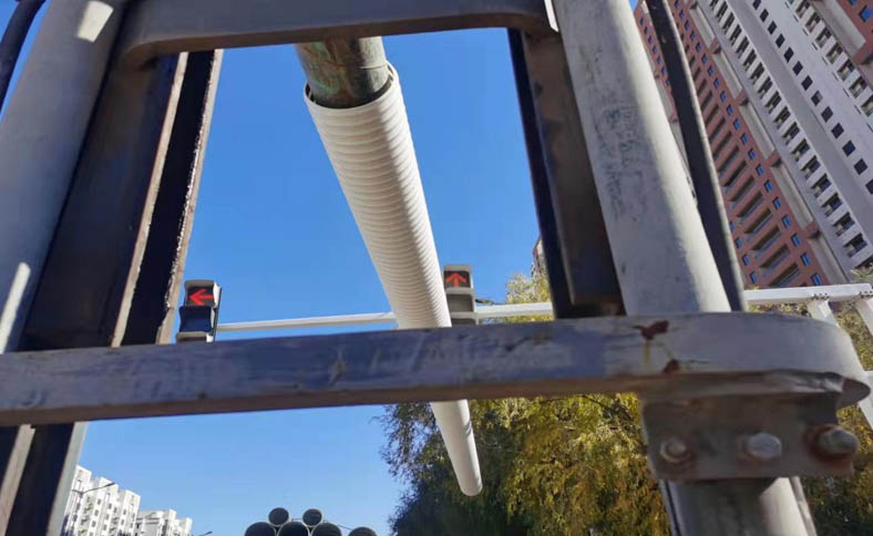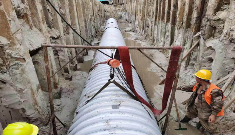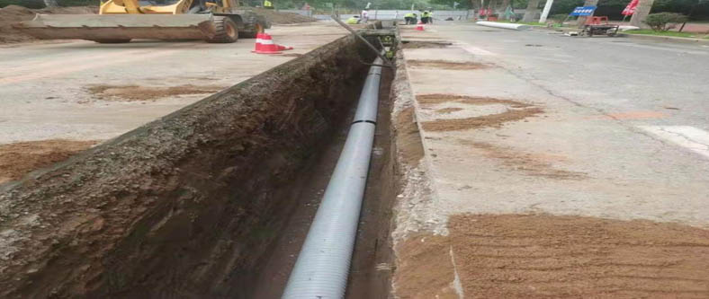 該工程中標后我公司也做到了多個首創,首先該工程選用鋼帶增強聚乙烯螺旋波紋管材為無色管材(即原料本色),該顏色管材為國內第一次生產并投入使用,是對我公司技術力量的一種考驗,最終在公司領導的帶領下,對生產工藝進行優化改進,成功生產出符合該項目要求并達到行業標準的管材;