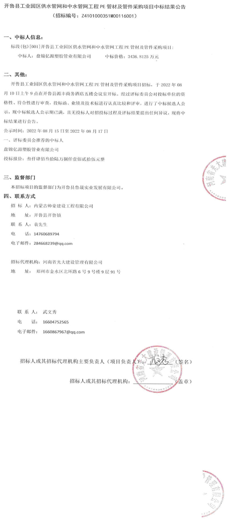 2022年8月10日,盤錦億源塑膠管業(yè)有限公司憑借綜合實力成功中標(biāo)開魯縣工業(yè)園區(qū)供水管網(wǎng)和中水管網(wǎng)項目工程,中標(biāo)金額:3436.8125萬元。