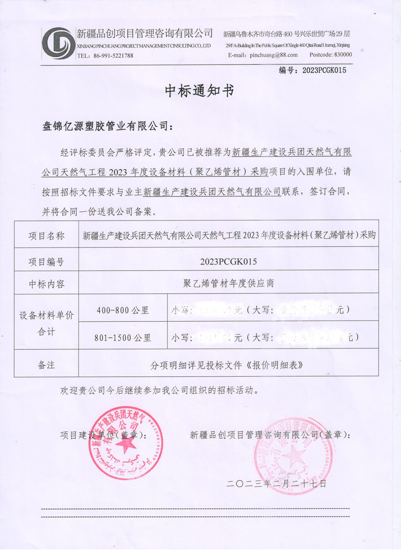 【熱烈慶祝億源管業(yè)成功中標(biāo)《新疆生產(chǎn)建設(shè)兵團(tuán)天然氣有限公司天然氣工程2023年度設(shè)備材料(聚乙烯管材)采購(gòu)項(xiàng)目》】